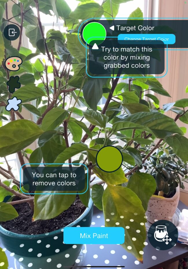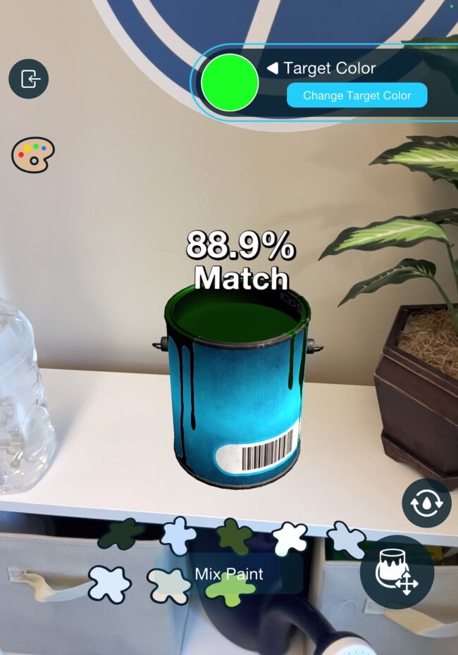 This AR Experiment was influenced by the real-world tiktok trend of people trying to guess the final color of mixed paint. In our experiment you can grab colors from the real world, combine them in a digital paint bucket, watch them mix together, and try to match a target color that we provide as close as possible. It’s oddly very compelling, and we’ve found ourselves playing it a lot in the office trying to hunt down objects that have the right shade of green or blue to try to match the given color.